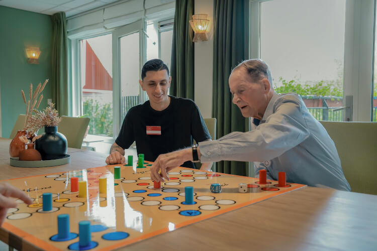 “Zal ik eerst uw medicijnen aangeven?” Meneer Hisam knikt en neemt een slok water. Jij helpt hem in zijn pyjamajasje en slaat daarna de deken recht. “Zo ligt u weer lekker.” Zijn ogen worden zwaar, terwijl jij het nachtlampje aandoet. Zo eindigt zijn dag rustig, met kleine rituelen die hem houvast geven.