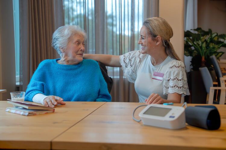 Je klopt zachtjes op de deur en stapt de kamer binnen. “Goedemiddag mevrouw Yilmaz, hoe gaat het met u?” Ze vertelt over het bezoek van gisteren terwijl jij de zorg voorbereidt. Jij luistert, checkt ondertussen haar medicatie en merkt dat zij wat onrustiger is dan anders. “Ik noteer het even, dan houden we het goed in de gaten," zeg je kalm. Even later help je mevrouw Yilmaz richting de huiskamer. “Ik zie dat u vanmiddag gaat zwemmen?” Ze knikt enthousiast. “Ja, daar verheug ik me op.”